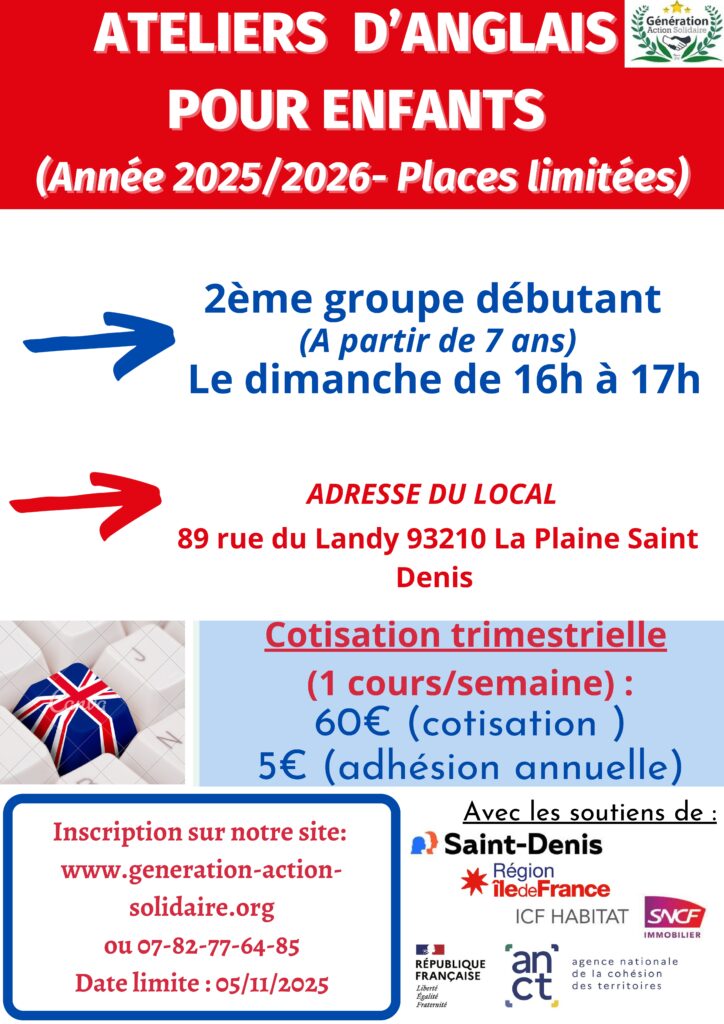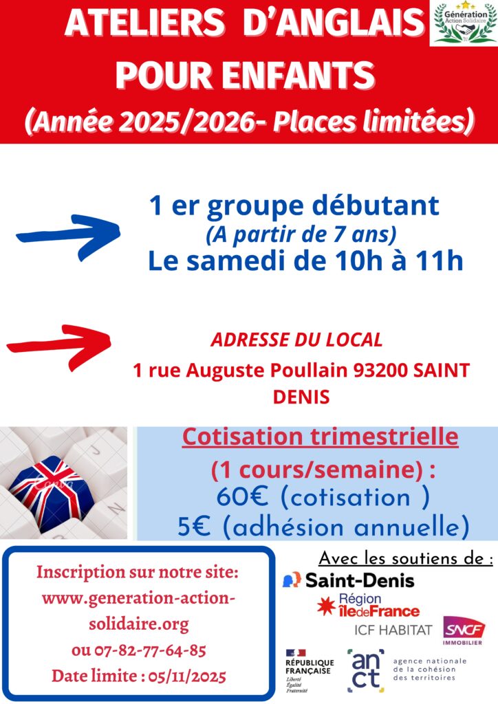 Génération Action Solidaire encourage l’apprentissage de l’anglais dès le jeune âge pour soutenir la réussite scolaire. Nos ateliers d’anglais permettent aux enfants de progresser naturellement à travers des activités ludiques et interactives.
